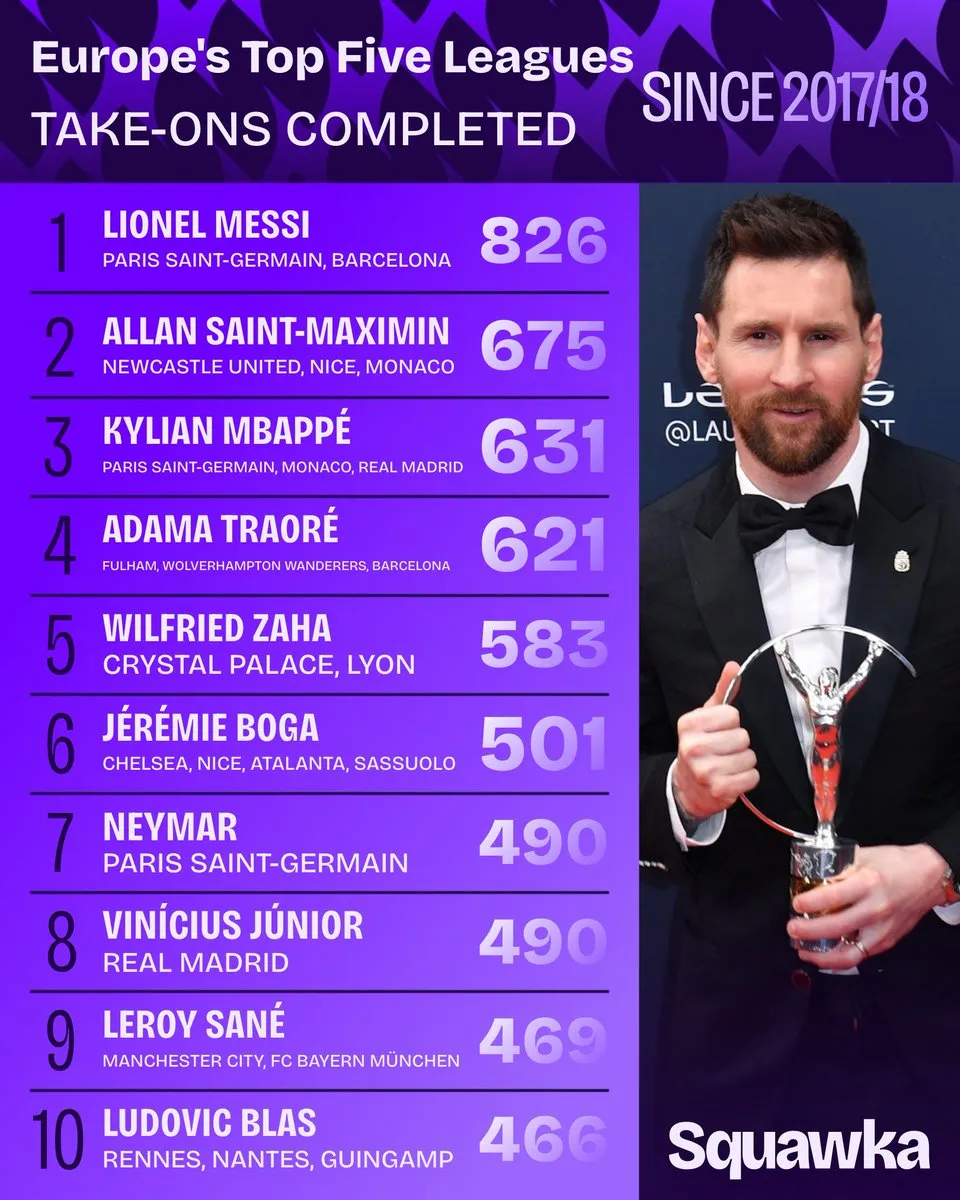 近9季五大联赛总过人榜:
