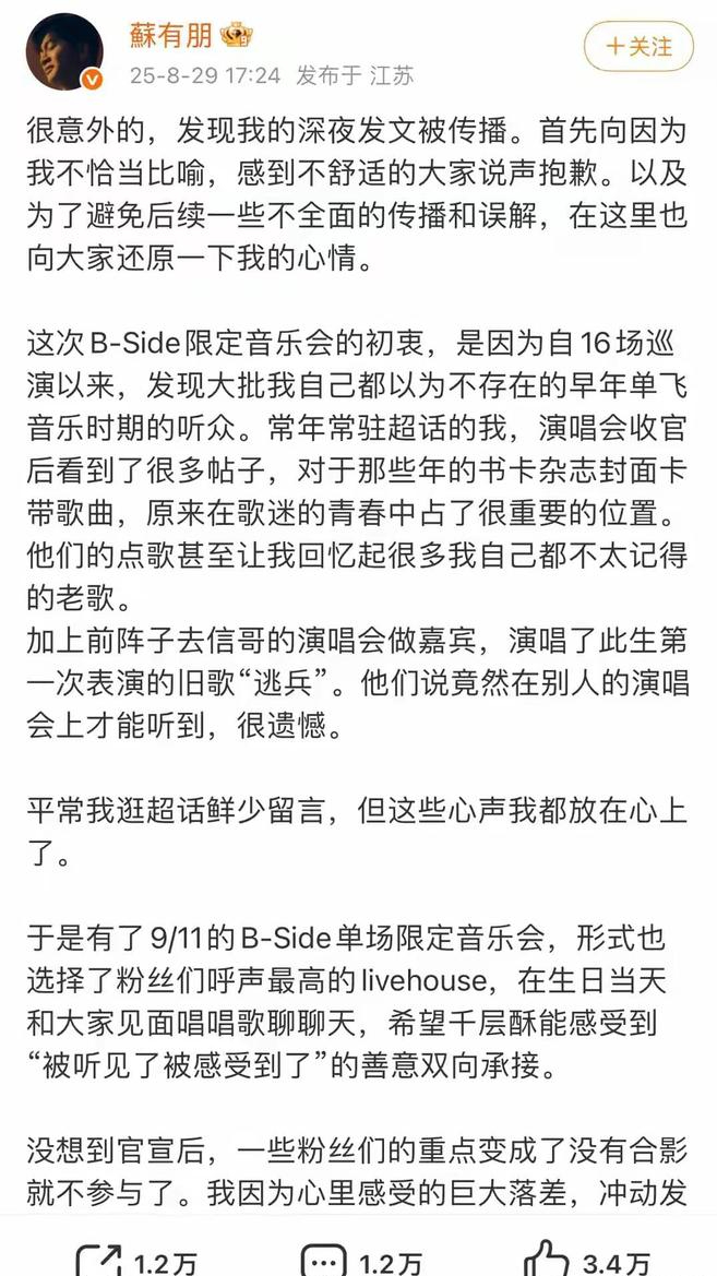 这种差异化服务本来也不算什么新鲜事,毕竟演艺圈里价格分层早就是常规操作。但问题出在后续的处理上。由于VIP票数量有限,很多粉丝抢不到,就只能退而求其次买普通票。有粉丝礼貌地建议能否开放普通票的合影权益,结果苏有朋在8月28日直接在社交媒体上怒怼:"这是音乐会,不是合影会。我卖艺不卖身。不爱音乐的人别来了,枉费伙伴们不计成本办单场。谢谢哦。"