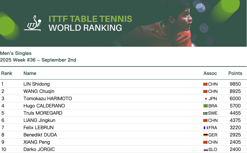 开云智能体验-国际乒联2025年第36周排名公布,孙颖莎保持断层第一